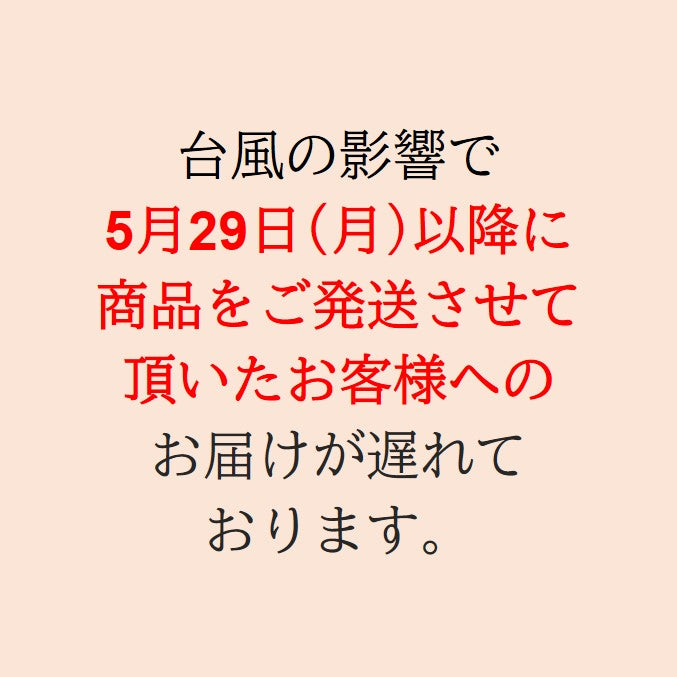 先週末にかけて沖縄を通過した台風の影響で、5月29日(月)以降に商品をご発送させて頂いたお客様へのお届けが遅れております。