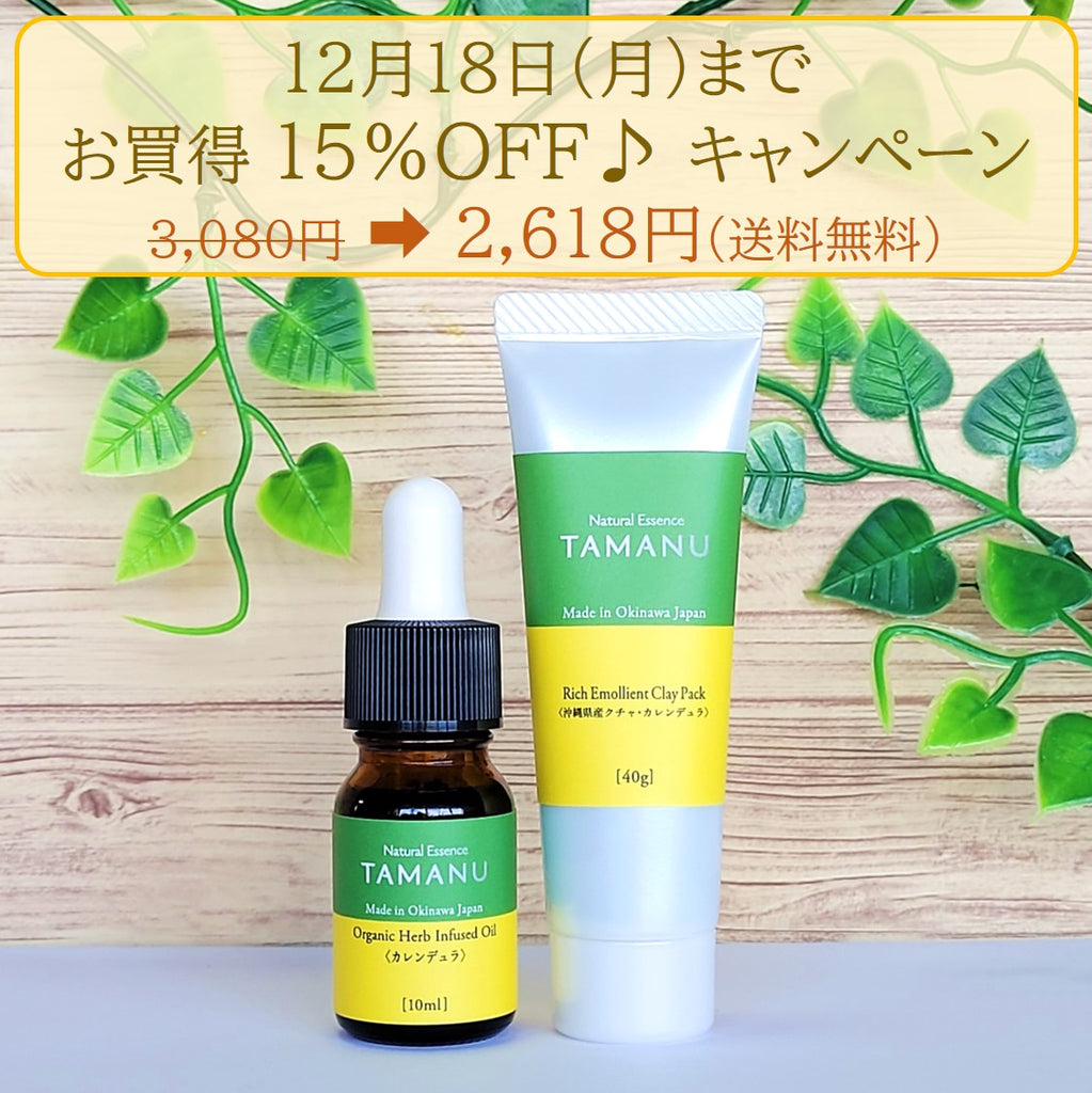 そんな『カレンデュラ』のエキスを丁寧に抽出したタマヌオイルと、これを贅沢に配合したクチャパックのセットが今だけ15%OFF♪